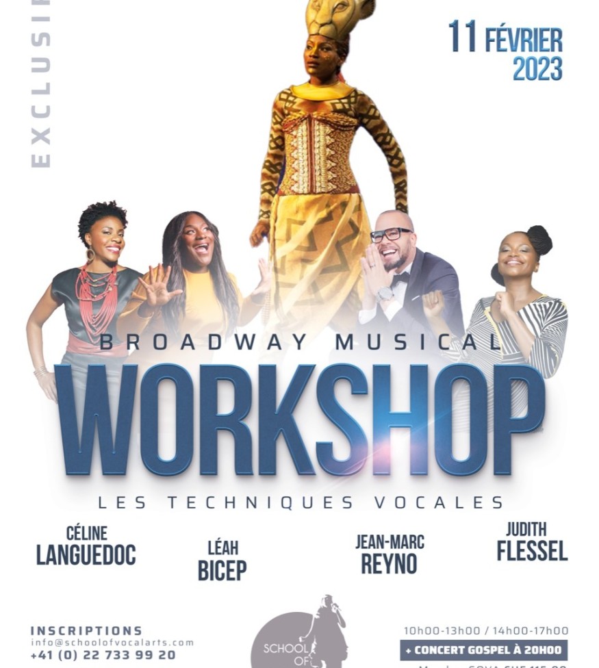 School Of Vocal Arts vous invite à un évènement exclusif des coaching vocaux , « le Broadway Musical Workshop » qui se déroulera le samedi 11 février 2023 à Esther House Bvd Voltaire 27, 1201 Genève de 10h à 13h et de 14h à 17h avec les incontournables artistes vocaux Céline LANGUEDOC, Léah BICEP, Jean-Marc REYNO et Judith FLESSEL . Cet évènement sera suivi d’un concert gospel à 20h. Les inscriptions pour ce coaching se feront par mail : info@schoolofvocalarts.com et par téléphone au +41 (0) 22 733 99 20.
