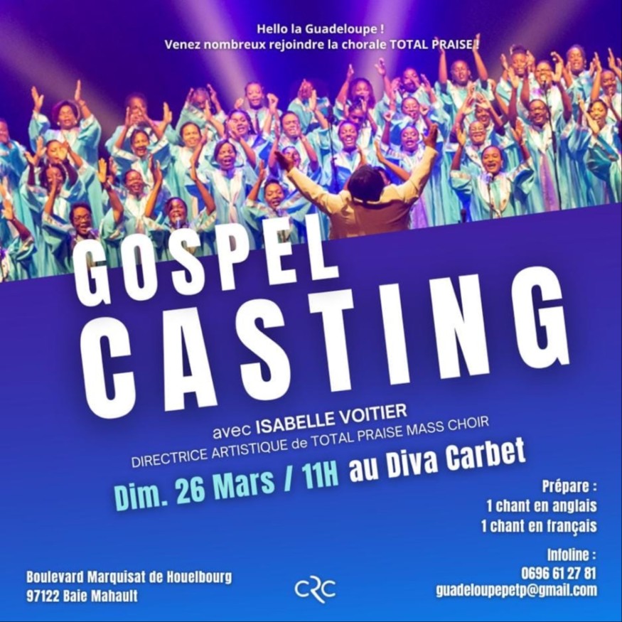 Total Praise pose ses valises en Guadeloupe et lance sa nouvelle formation dans l'île. Le casting est ouvert à tous. RDV Dimanche 26 mars 2023 à 11h au Diva Cabaret à Jarry, pour un casting en présence d'Isabelle Voitier, Directrice Artistique de Total Praise. Merci de préparer 1 titre en anglais et 1 titre en français.
