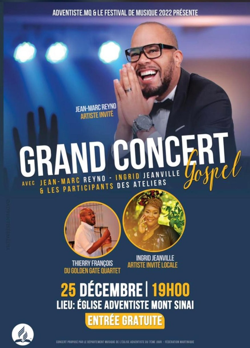 Le département musique de l'Eglise Adventiste du 7ème jour de Martinique vous invite à son Grand Concert Gospel qui se déroulera le dimanche 25 Décembre 2022 à l'Eglise Adventiste du Mont Sinai à 19h00 avec le chanteur de gospel francophone incontournable, Jean-Marc REYNO