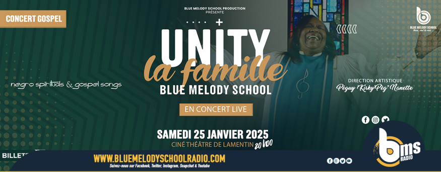 Le 25 décembre prochain à 20h, le Ciné Théâtre de Lamentin vibrera au son de la Gospel Music avec le concert « Unity - La Famille Blue Melody School ». Ce rendez-vous exceptionnel marquera une première entièrement en live pour Blue Melody School, la l’école de chant Gospel en Guadeloupe, qui célèbre bientôt 17 années de passion et de transmission musicale.